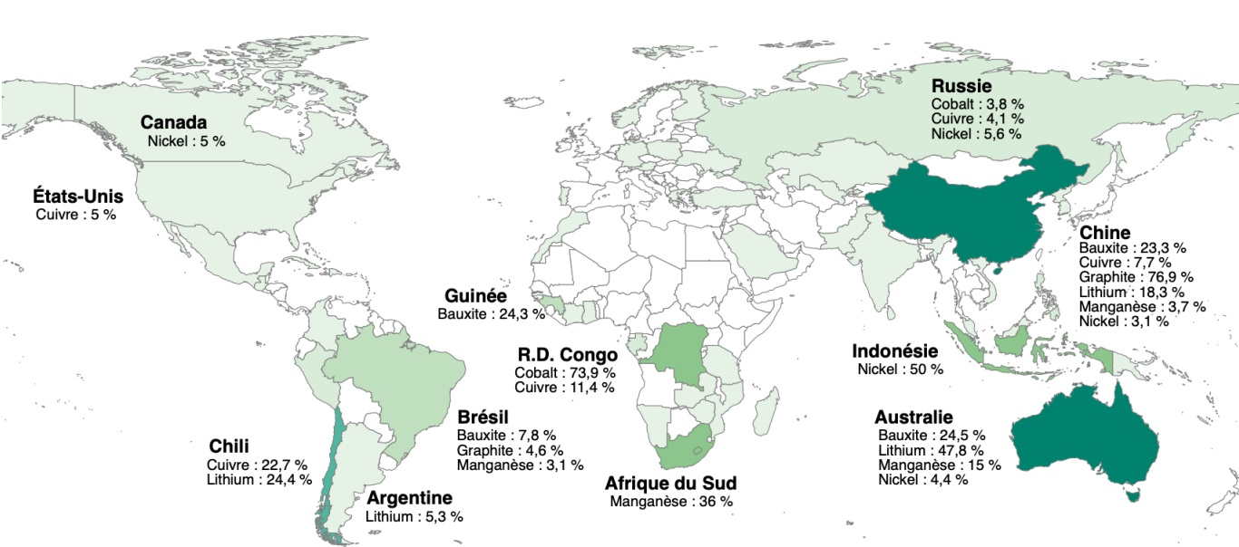 Les batteries lithium-ion concentrent une large quantité de matériaux1 dits «critiques»: lithium, cobalt, nickel, cuivre, graphite ou encore manganèse. Ces éléments sont indispensables au bon fonctionnement des cellules électrochimiques, elles-mêmes composants essentiels des batteries. Chaque cellule est capable de stocker l’énergie électrique chimiquement à partir d’une anode, d’une cathode et d’un électrolyte. Aujourd’hui, l’Europe fait face à un nouveau défi: l’extraction de ces matériaux est géographiquement concentrée. L’Australie domine le lithium, la République Démocratique du Congo (RDC) le cobalt, et la Chine le graphite et le raffinage de presque tous ces matériaux, comme l’illustre la carte ci-dessous.