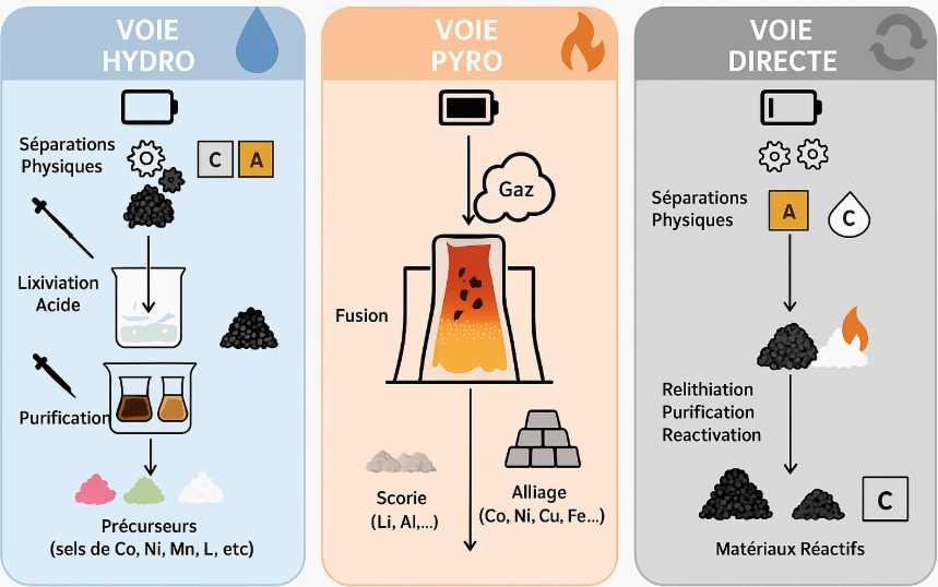 Les procédés actuels de recyclage des batteries li-ion permettent des taux de récupération variables selon la technologie employée. Les chiffres à atteindre d’ici 2030 concernant la pyrométallurgie s’élèveraient à une récupération du cobalt jusqu’à 95% et environ 90% du nickel. Cependant, le process en lui-même présente des pertes importantes de lithium et de graphite. De plus, elle est énergivore et génère des émissions de CO2. L’hydrométallurgie permettrait, selon des conditions de traitement performantes, une récupération d’environ 80% du lithium, grâce à des procédés chimiques en solution aqueuse. Cependant, elle nécessite une gestion stricte en raison des rejets toxiques.