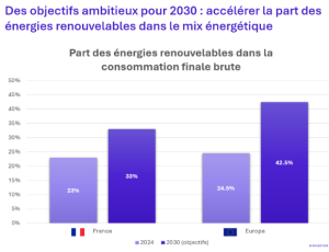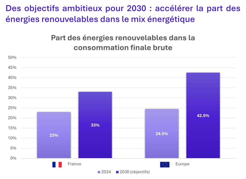 Le secteur des énergies renouvelables connaît une transformation profonde pour répondre aux objectifs climatiques ambitieux. L’Union européenne vise 42,5% d’énergies renouvelables dans la consommation finale d’ici 2030, tandis que la France doit passer de 23% en 2024 à 33% à la même échéance. Cette dynamique s’accompagne de défis majeurs : incertitudes réglementaires (moratoire, baisse des soutiens tarifaires, retard de la PPE), pression économique liée au ralentissement des financements publics et nécessité de sécuriser la rentabilité des projets.