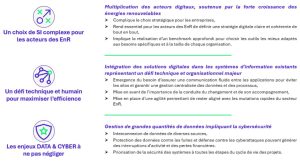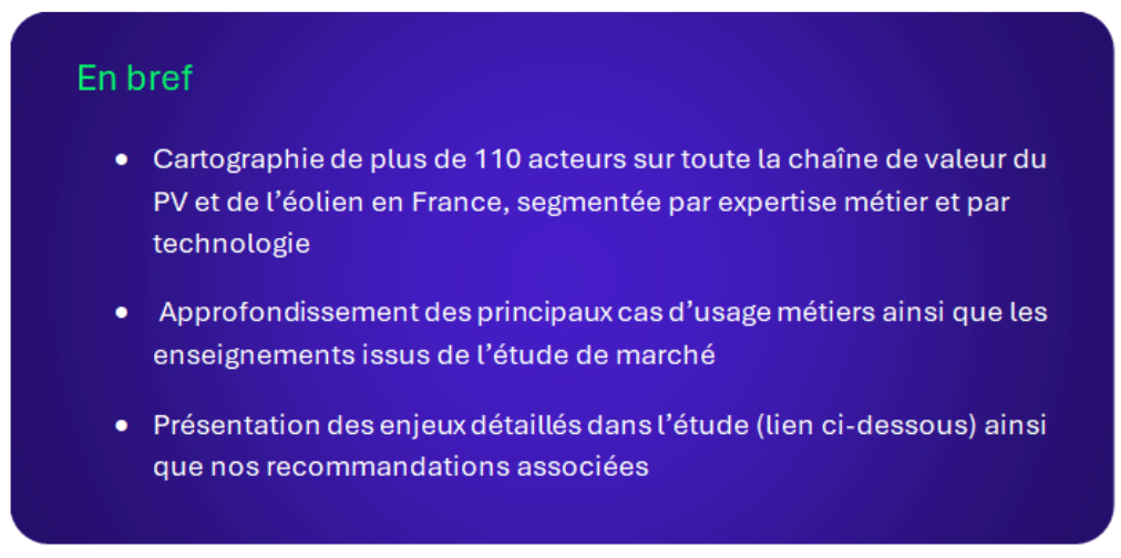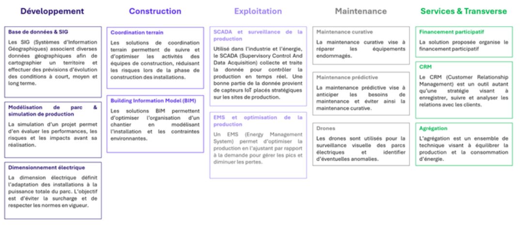 L’écosystème digital des énergies renouvelables connaît une accélération, portée par la multiplication des solutions SaaS et l’absence de processus standardisés. Les éditeurs de logiciels spécialisés dominent le marché, tandis que les fabricants d’assets cherchent à élargir leur offre en proposant des services intégrés pour l’exploitation et la maintenance. On observe également le développement de solutions internes par les énergéticiens historiques, afin de répondre à des besoins spécifiques et renforcer leur positionnement.