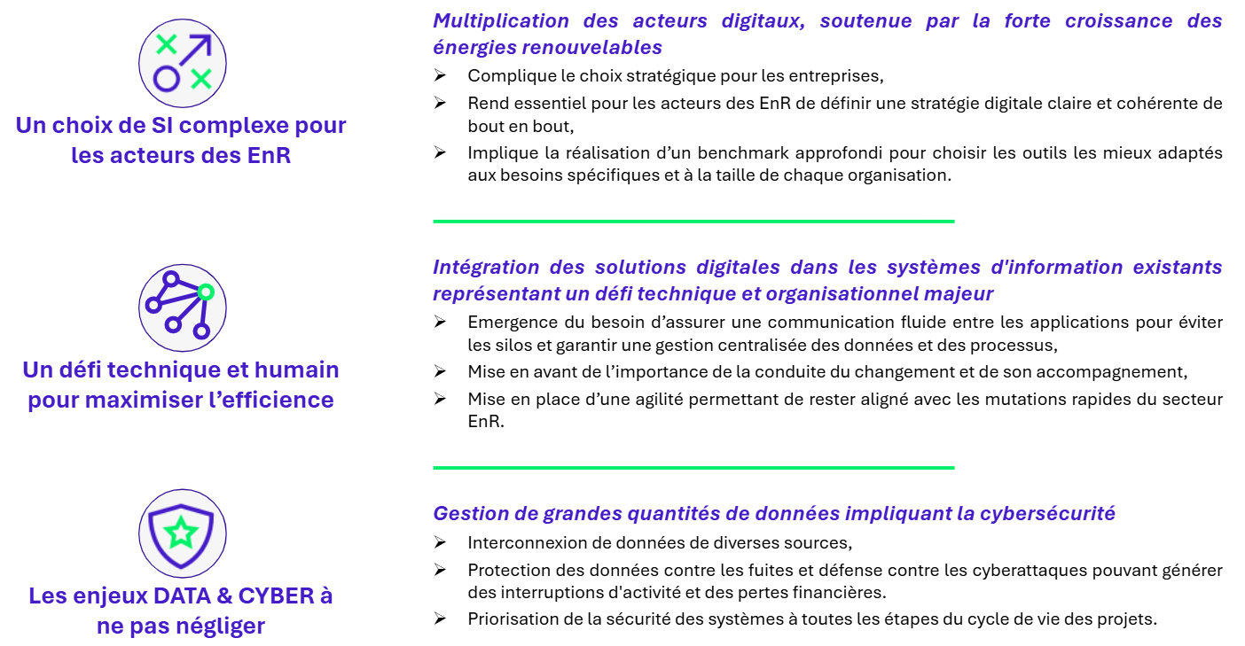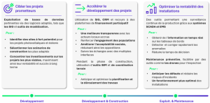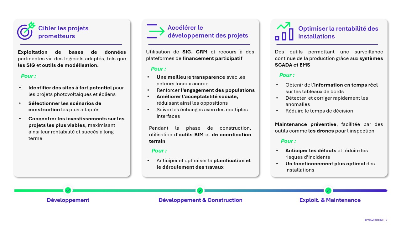 Dans ce contexte, la digitalisation devient un levier stratégique. Les acteurs – développeurs, exploitants, fabricants – adoptent des solutions numériques pour optimiser la chaîne de valeur, de la conception à l’exploitation. Ces outils permettent d’améliorer la prospection des sites, la modélisation des parcs, la coordination des chantiers, la surveillance en temps réel et la maintenance prédictive. L’IoT et l’analyse avancée des données renforcent la performance et la résilience des installations, tout en facilitant l’intégration au réseau électrique.