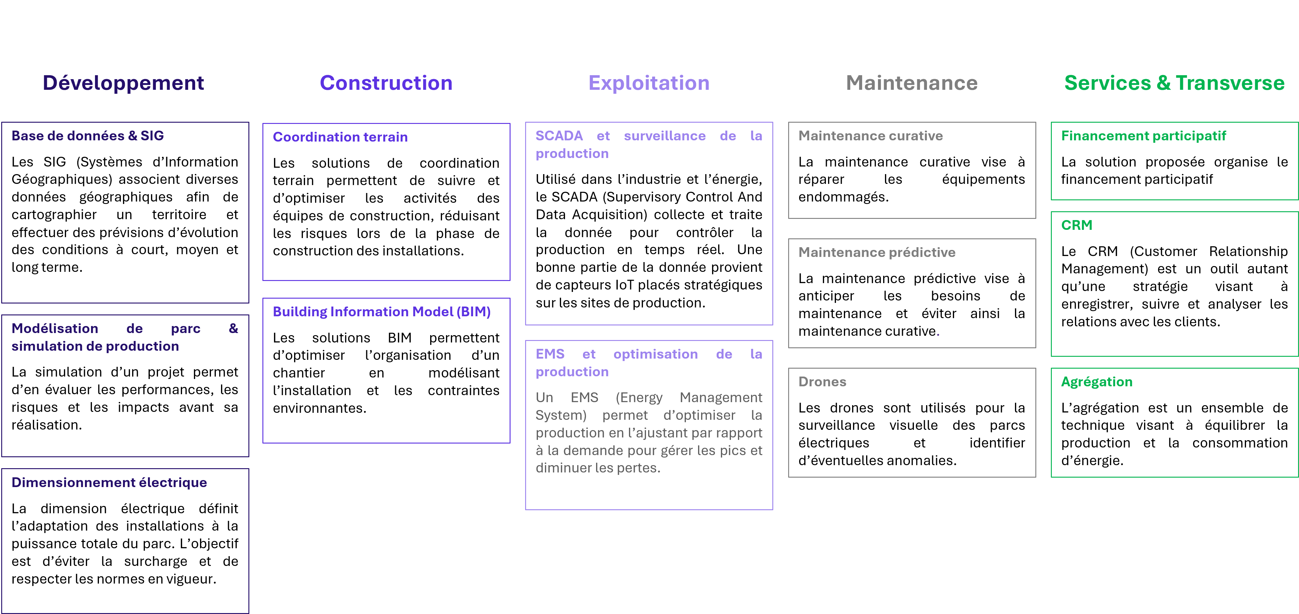 L’écosystème digital des énergies renouvelables connaît une accélération, portée par la multiplication des solutions SaaS et l’absence de processus standardisés. Les éditeurs de logiciels spécialisés dominent le marché, tandis que les fabricants d’assets cherchent à élargir leur offre en proposant des services intégrés pour l’exploitation et la maintenance. On observe également le développement de solutions internes par les énergéticiens historiques, afin de répondre à des besoins spécifiques et renforcer leur positionnement. La majorité des solutions présentées dans le radar s’appuient sur des technologies innovantes telles que la GenAI, l’AIoT, les jumeaux numériques et les drones. Ces outils permettent d’optimiser la production, la maintenance prédictive, la gestion des actifs et la valorisation sur les marchés de l’énergie.