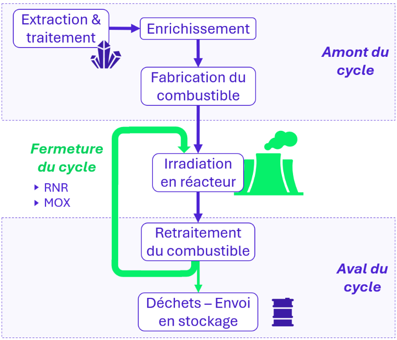 Par ailleurs, la raréfaction de l’uranium ne constitue pas un défi immédiat, mais pourrait devenir un enjeu majeur avec l’essor mondial du nucléaire. Pour sécuriser l’approvisionnement, la fermeture du cycle apparaît comme une solution clé. Cette expression désigne la réinjection de tout ou partie du combustible usagé au début de la chaîne, par un processus de recyclage lui permettant de resservir. La France vise une fermeture complète d’ici la fin du siècle.